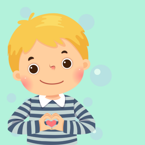 Illustration: Ein Kind steht lächelnd vor Seifenblasen und formt mit seinen Händen eine Herzgeste.
